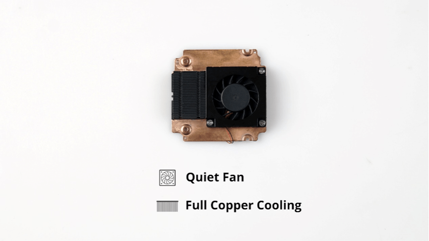Последний основной компонент системы — кулер, который состоит из медной охлаждающей пластины и бесшумного вентилятора. Эффективность рассеивания тепла превосходна. При этом, когда вентилятор работает на полной скорости, шум составляет менее 20 дБ.