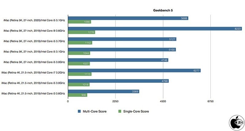 В Geekbench попала версия 27-дюймового iMac, оборудованного процессором Intel Core i5 с тактовой частотой 3.1 ГГц и графикой Radeon Pro 5300. Результаты устройства сравнили с iMac 2019 года.