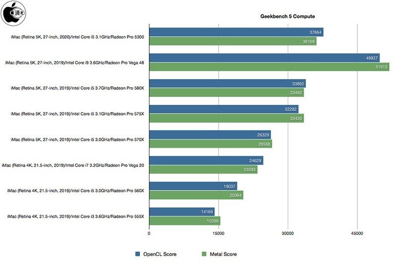 Графические возможности моноблока были измерены с помощью тестов Geekbench Compute. По сравнению с iMac 2019 года (AMD Radeon Pro 570X), iMac 2020 года (Radeon Pro 5300) работает примерно на 40% быстрее.