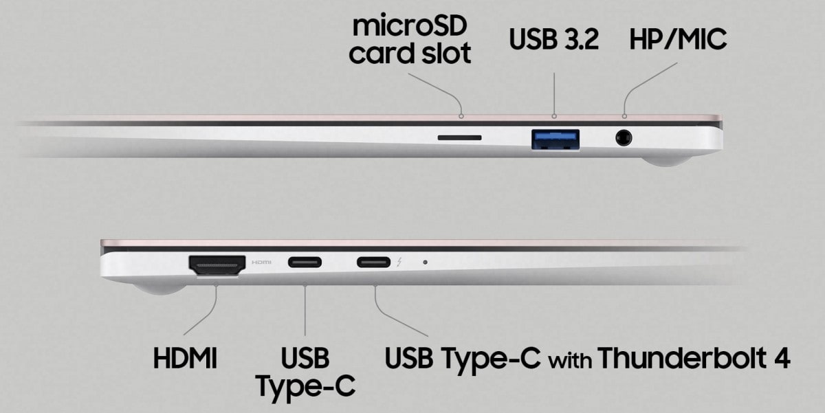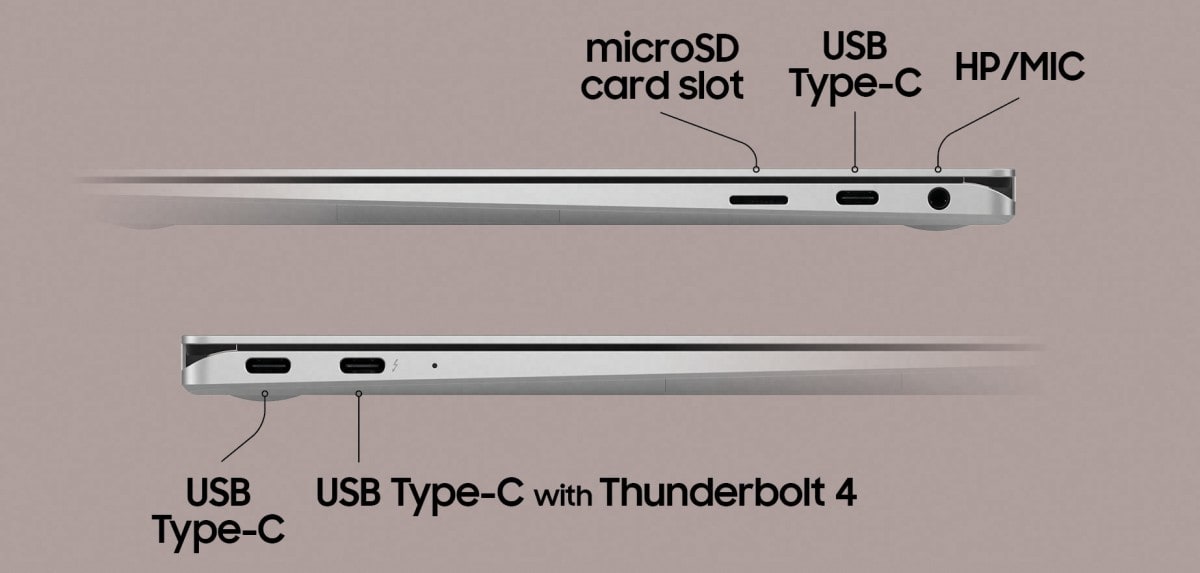 Выбор портов довольно приличный — в 15,6-дюймовой модели один порт Thunderbolt 4, один порт USB-C, один порт USB-A 3.2, порт HDMI, 3,5 мм комбинированный разъем для наушников/микрофона и слот для microSD карт. Модель с диагональю 13,3 дюйма лишена порта HDMI, но получила дополнительный слот для карты nano-SIM.