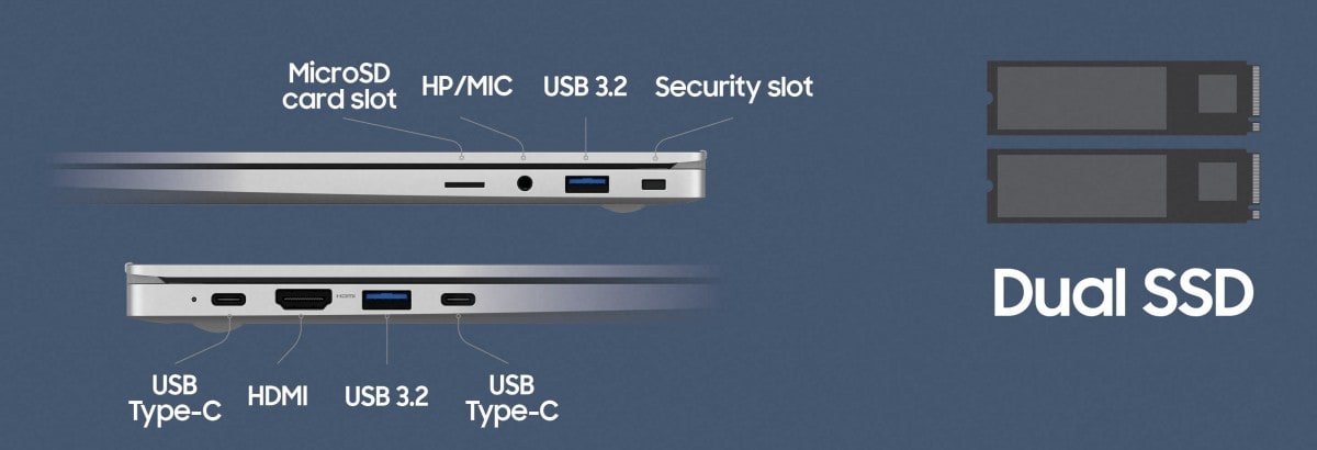 В отличие от Galaxy Book Odyssey, у модели Galaxy Book есть поддержка LTE вместе с Wi-Fi 6. Выбор портов тоже отличный: два порта USB-C, два порта USB-A 3.2, HDMI, комбинированный разъем, слот безопасности, а также слоты для microSD карты и nano-SIM.