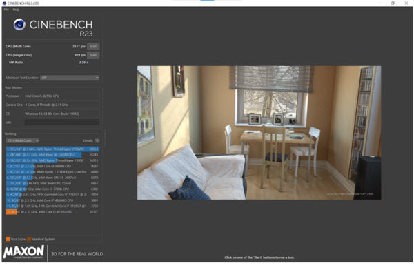 Cinebench R23 позволил провести тестирование процессора на движке Cinem4D. Этот тест помогает оценить производительность процессора и видеокарты путем выполнения с их помощью операций рендеринга высокоточных изображений и 3D-графики. CoreBook X получил в этом бенчмарке 979 баллов, а оценка многоядерных тестов — 3517 баллов, что не сильно отличается от результата, показанного процессором Core i7-1165G7.