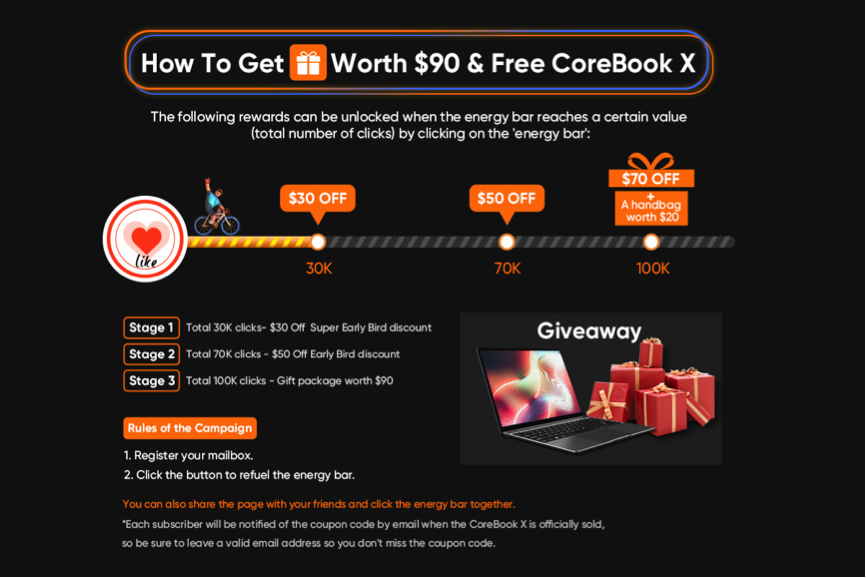 До начала продаж Chuwi запустила на сайте несколько рекламных акций: «Собирайте лайки и наслаждайтесь скидками», «Выиграйте CoreBook X бесплатно» и другие. Покупатели CoreBook X, принявшие в них участие, получат дополнительно один год гарантии послепродажного обслуживания.