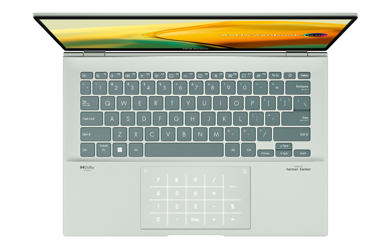 Он демонстрирует современный вид серии Zenbook с новым смелым дизайном крышки в двух элегантных цветах: «зеленый селадон» (Aqua Celadon) и «задумчивый синий» (Ponder Blue).