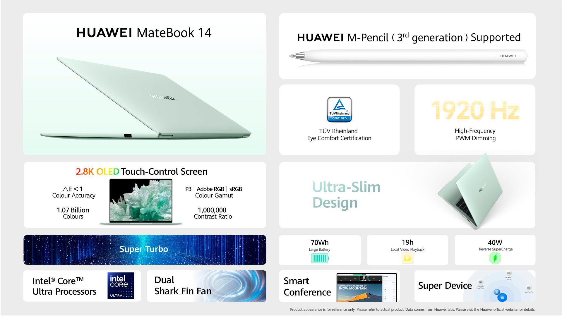Ноутбук весит 1.31 кг, имеет толщину 14.5 мм, выпускается в зеленом и космическом сером цветах. Аккумулятор емкостью 70 Вт·ч обеспечивает до 19 часов воспроизведения локального видео с разрешением 1080p. Новинка оборудована камерой с разрешением 1080p, технологией антенн метаматериалов от Huawei и поддерживает инновационные функции, типа Hyper Terminal.