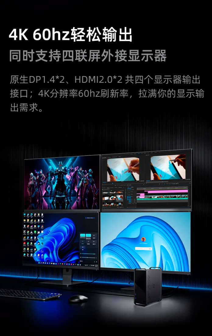Мини-ПК имеет четыре вывода для дисплеев: HDMI 2.0 (x2), USB-A (x6), DisplayPort 1.4 (x2) и сетевой порт 2.5G. Модель поддерживает вывод видео в разрешении до 4K с частотой обновления 60 Гц. Также мини-компьютер оснащен интерфейсом питания постоянного тока и 3.5-мм разъемом для наушников.