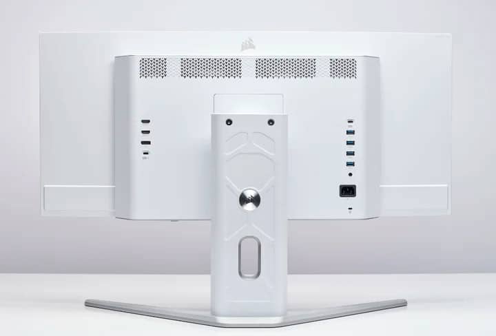 Подставка монитора обеспечивает регулировку высоты, наклона и поворота. Corsair предлагает трехлетнюю гарантию на отсутствие выгорания и бесперебойную работу пикселей.