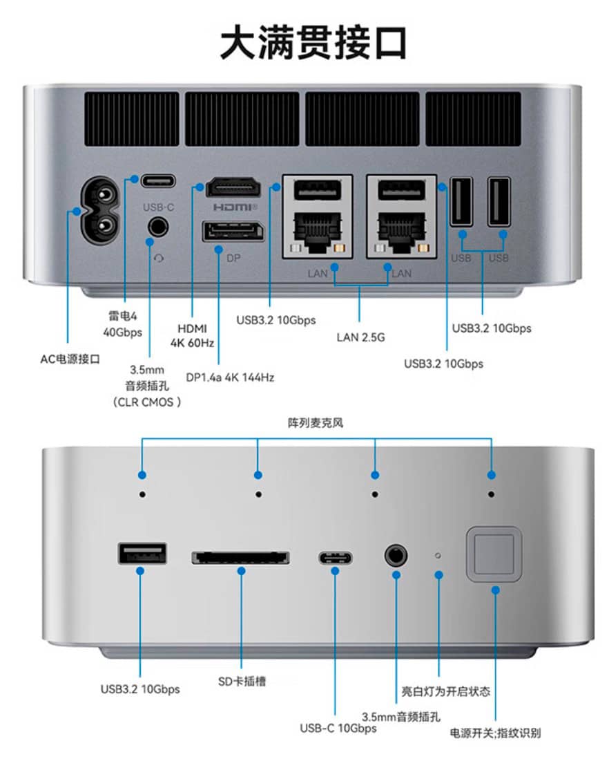 Beelink GTi14 оснащен оперативной памятью объемом 32 ГБ и SSD емкостью 1 ТБ, 2 Ethernet-порта со скоростью передачи данных до 2.5 Гб/с, порт USB-C со скоростью передачи данных 40 Гб/с, HDMI, DisplayPort 1.4a, USB 3.2 Type-A со скоростью 10 Гб/с.