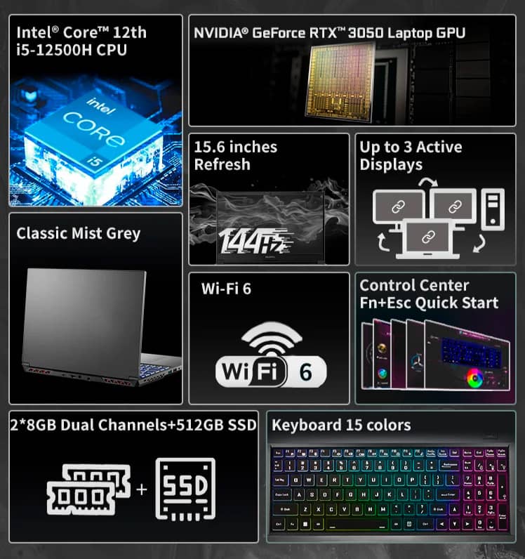 Colorful X15 XS 2025 оснащен процессором Intel Core i5-12500H 12-го поколения и видеокартой NVIDIA RTX 3050. Вес устройства составляет 2.1 кг. Оно оснащено 16 ГБ оперативной памяти DDR4, с возможностью расширения до 64 ГБ, и твердотельным накопителем NVMe объемом 512 ГБ. Также имеется дополнительный слот M.2 для расширения хранилища.