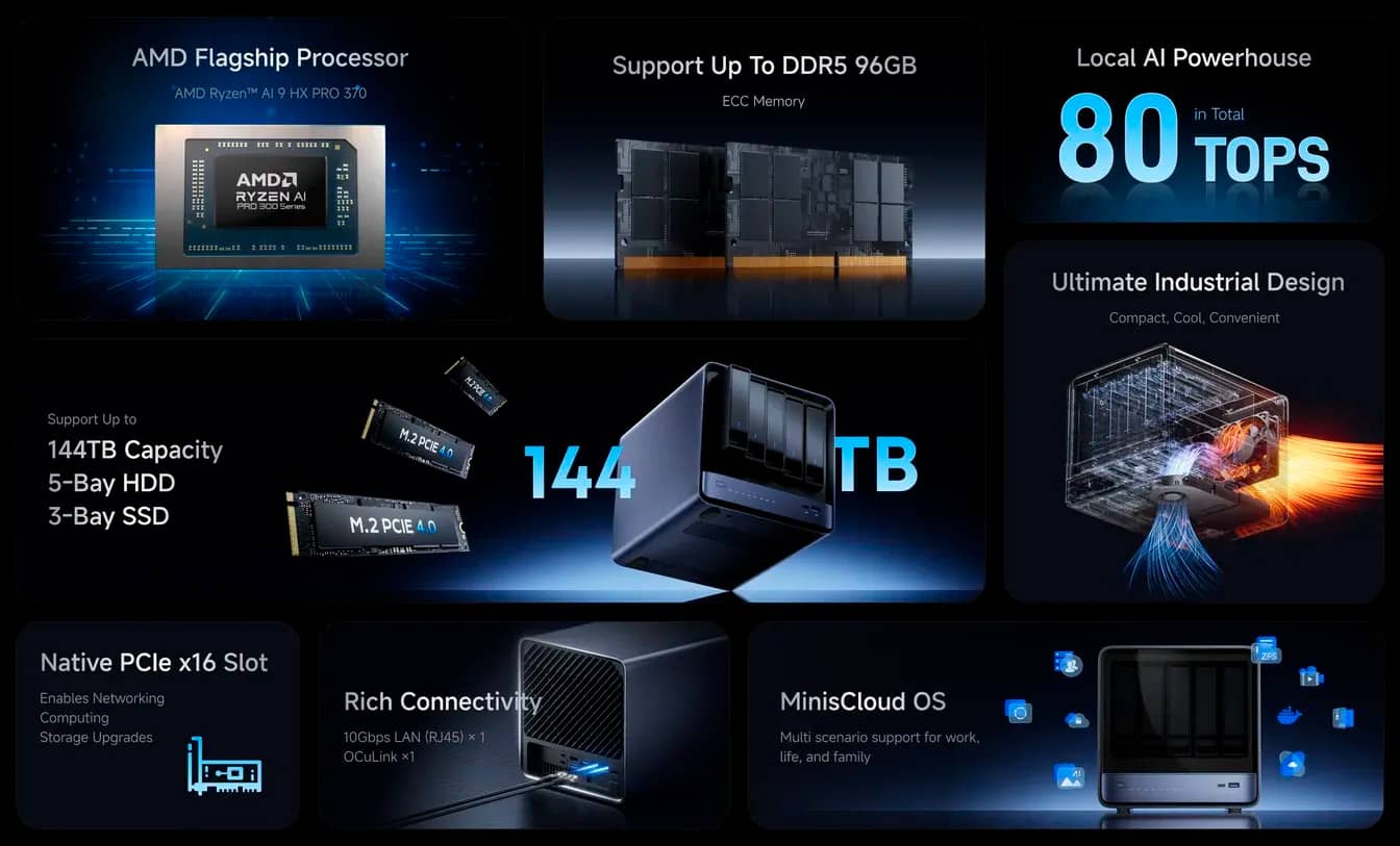 В основе N5 Pro лежит APU AMD Ryzen AI 9 HX PRO 370 с 12 ядрами архитектуры Zen 5C. Особенность модели — интегрированная графика Radeon 890M. Более того, наличие HDMI-выхода фактически превращает N5 Pro в полноценный настольный компьютер с большим запасом памяти и расширенными вариантами подключения.