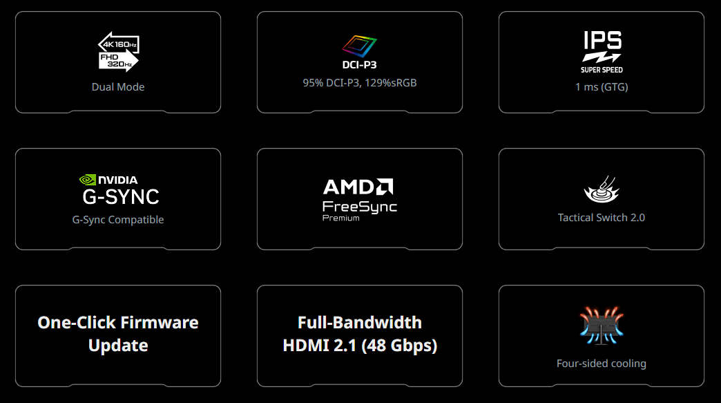 Главная особенность модели — технология Tactical Dual Mode, позволяющая одним нажатием переключаться между режимами повышенного разрешения и повышенной частоты обновления. Функция Tactical Switch 2.0 дает возможность менять соотношение сторон и профили производительности без необходимости проходить через множество меню.