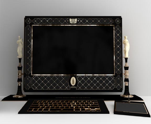 «Самый стильный и сложный компьютер в исполнении. Цена: 6.200.000 (120.000 евро) За основу взят настольный iMac с диагональю экрана 27 дюймов. Корпус компьютера полностью заменен на оникс (по желанию это могут быть малахит, жадеит и т.п.). Монитор опирается на 2 фигуры греческих девушек выполненных из бивня мамонта. Логотип выполняется из золота и может быть выполнен в виде монограммы заказчика. Сроки изготовления 3 месяца».