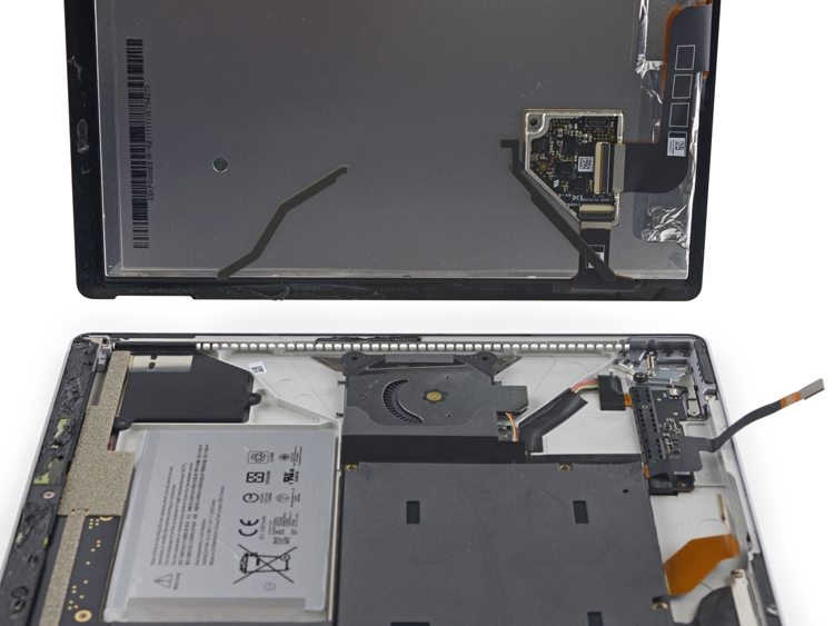 Процессор и оперативная память припаяны к основной плате. Дисплей связан с защитным стеклом, причем его демонтаж очень сложный. Многие компоненты удерживаются на месте с помощью клея, а их замена требует приложения больших усилий.