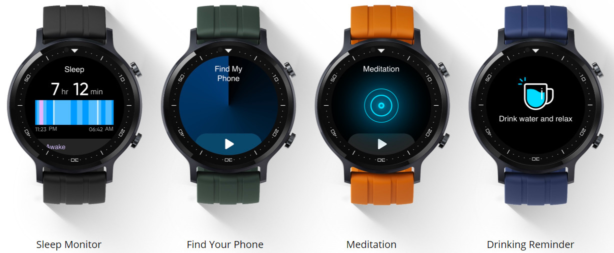 Realme Watch S показывают оповещения с сопряженного смартфона, позволяют управлять музыкой и камерой. Предусмотрены функции отслеживания сна, поиска сопряжённого смартфона, медитации, напоминания о необходимости выпить воды.