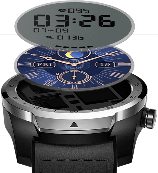 TicWatch Pro S имеет такой же двухслойный дисплей, который мы видели в других Pro-моделях. Верхний — это LCD-экран для основного режима, а под ним находится AMOLED-экран для интеллектуального режима. Оба имеют размер 1,39 дюйма.