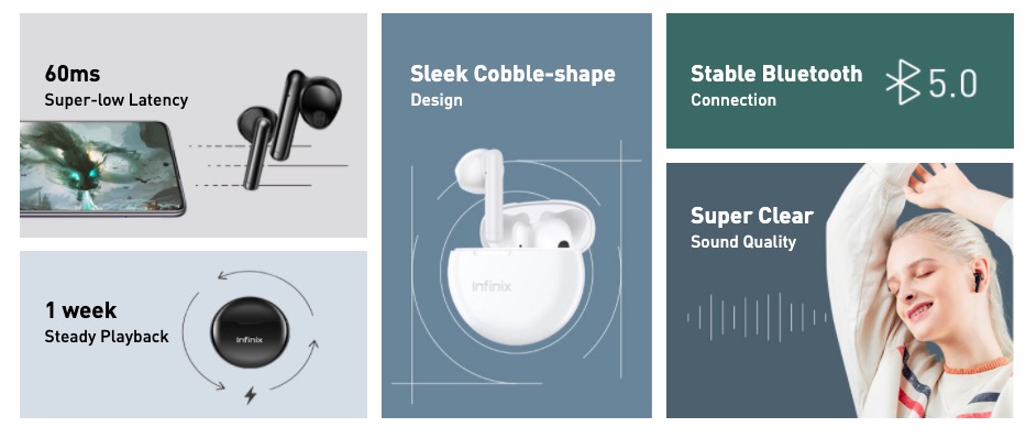 Infinix XE20 поставляется с зарядным чехлом овальной формы, который похож почти на все бюджетные TWS-наушники на рынке. Они также оснащены высокоэффективной композитной диафрагмой с поддержкой аудиокодеков AAC и SBC.