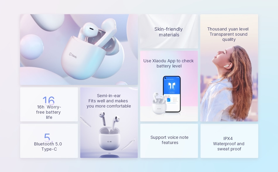 Производитель заверяет, что ему удалось совместить в наушниках красоту и комфорт. При производстве Xiaodu Du Smart Buds TWS использовались только приятные для кожи материалы. Они получили эргономичный дизайн на основе поверхности ушной раковины. Вес одного наушника составляет всего 3.7 г, поэтому они практически не ощущаются в ухе, что позволяет пользоваться устройством продолжительный период времени.