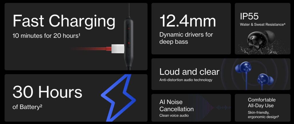 OnePlus Bullets Wireless Z2 обещают до 30 часов воспроизведения и оснащены быстрой проводной зарядкой, которая обеспечивает 20 часов воспроизведения звука всего за 10 минут зарядки.