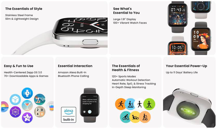 Умные часы оборудованы биометрическим датчиком Amazfit BioTracker PPG, который способен отслеживать частоту сердечных сокращений и уровень кислорода в крови. Этот датчик также предупреждает пользователя о необычных показателях сердечного ритма, высоком уровне стресса или низком уровне кислорода. Amazfit Bip 5 Unity поддерживают более 120 режимов спортивной активности. Кроме того, в них предусмотрен голосовой помощник Amazon Alexa.