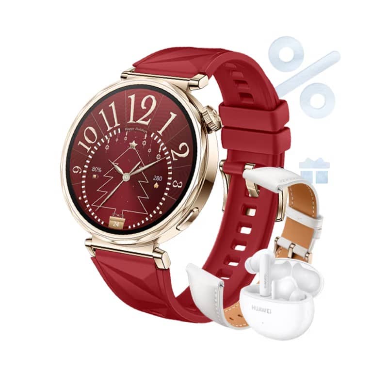 Huawei Watch GT 5 Christmas Edition представлены с двумя новыми фтороэластомерными ремешками — зеленым для 46-мм модели и красным для 41-мм версии. Помимо праздничного ремешка, также можно выбрать один из двух классических вариантов: черный (фтороэластомер) или коричневый (кожа) для часов 46 мм и белый (кожа) или золотой (металл) для модели 41 мм. Выбор ремешка также влияет на цвет корпуса часов.