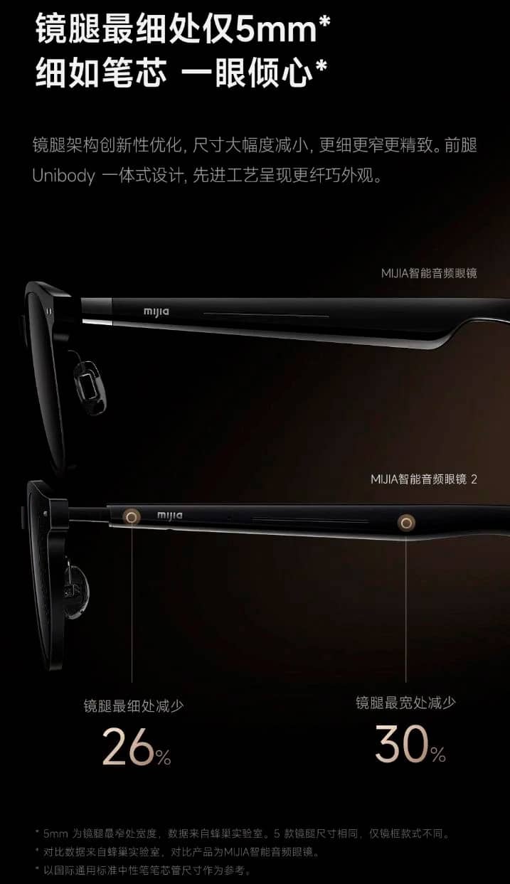 Производительность в области аудио была улучшена благодаря оптимизированной акустической структуре, обеспечивающей улучшение громкости и снижение уровня шума. Массив из четырех микрофонов с интеллектуальными алгоритмами улучшает качество звонков, а новый режим конфиденциальности значительно снижает утечку звука с помощью инверсных звуковых волн и антипомеховых мембран. Пользователи могут активировать эту функцию через приложение Mijia Glasses.