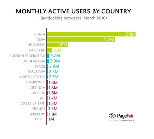 По данным PageFair, за последний год количество пользователей мобильных адблокеров увеличилось на 90%. Особой популярностью пользуются блокировщики в Китае (159 млн пользователей), Индии (122 млн) и Индонезии (38 млн). В этих странах блокировщики рекламы установлены примерно на 2/3 всех смартфонов.