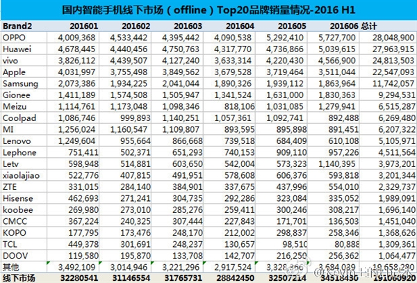 В общем зачете лидером стала Huawei, за ней Oppo, Apple, vivo и Xiaomi. Далее следуют Samsung, Meizu, Gionee, LeTV и Coolpad.
