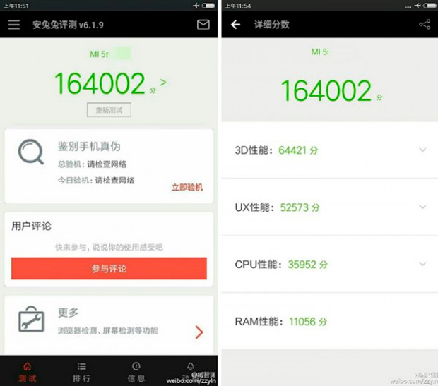 В этот же день в социальной сети Weibo появились скриншоты Xiaomi Mi 5S, на которых видно, что устройство в том же Antutu набирает 164 002 балла, что является практически идентичным результатом.