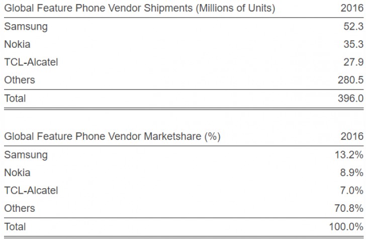 35 млн телефонов Nokia составляют 8.9% от общего числа проданных в 2016 году «звонилок». Однако это лишь второй результат, так как лидером в этом сегменте является Samsung, которая продала 52 млн простых телефонов, забрав 13.2% рынка. После них, на третьем месте, расположилась TCL-Alcatel, на счету которой 28 млн телефонов (7% рынка).