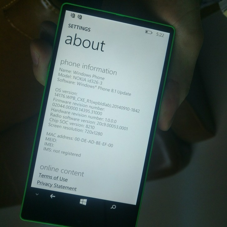 Смартфон имеет номер модели Nokia id326-3. Размер его экрана не известен, но рамки оказались достаточно тонкими. Примечательно, что работает прототип на базе Windows Phone 8.1.