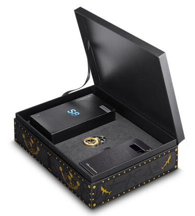 Коробка устройства выполнена в виде сундука с сокровищами. В нем располагается сам смартфон, защитный чехол и специальная липучка с кольцом, осуществляющая роль подставки.