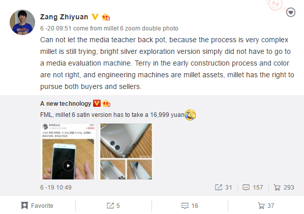 Zang Zhiyuan попросил пользователей, ожидающих анонса Xiaomi Mi 6 Silver Edition, запастись терпением, так как процесс создания корпуса оказался гораздо сложнее, чем предполагалось. Производителю катастрофически не хватает материалов для массового выпуска глянцевого флагмана.