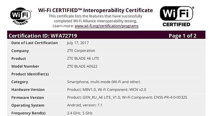 Новый смартфон компании ZTE был сертифицирован WiFi Alliance (WFA).