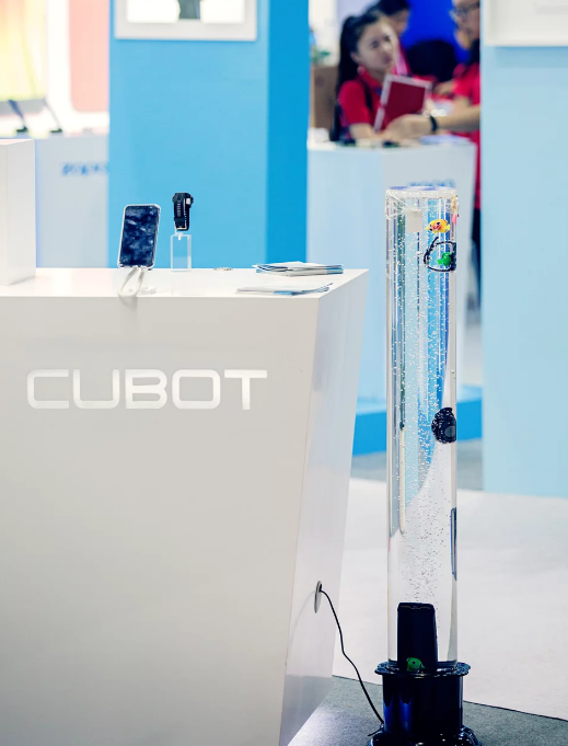 На выставке компания Cubot установила резервуар с водой высотой до 1.5 метра, на дне которого оставила смартфон King Kong. Защита по стандарту IP68 позволяет девайсу оставаться невредимым.