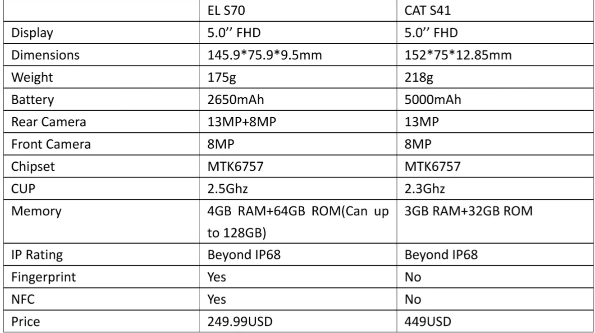 Как видно, в плане характеристик EL S70 оказался гораздо интереснее CAT S41. Кроме того, его ценник оказался гораздо ниже американского конкурента и составляет порядка $250.