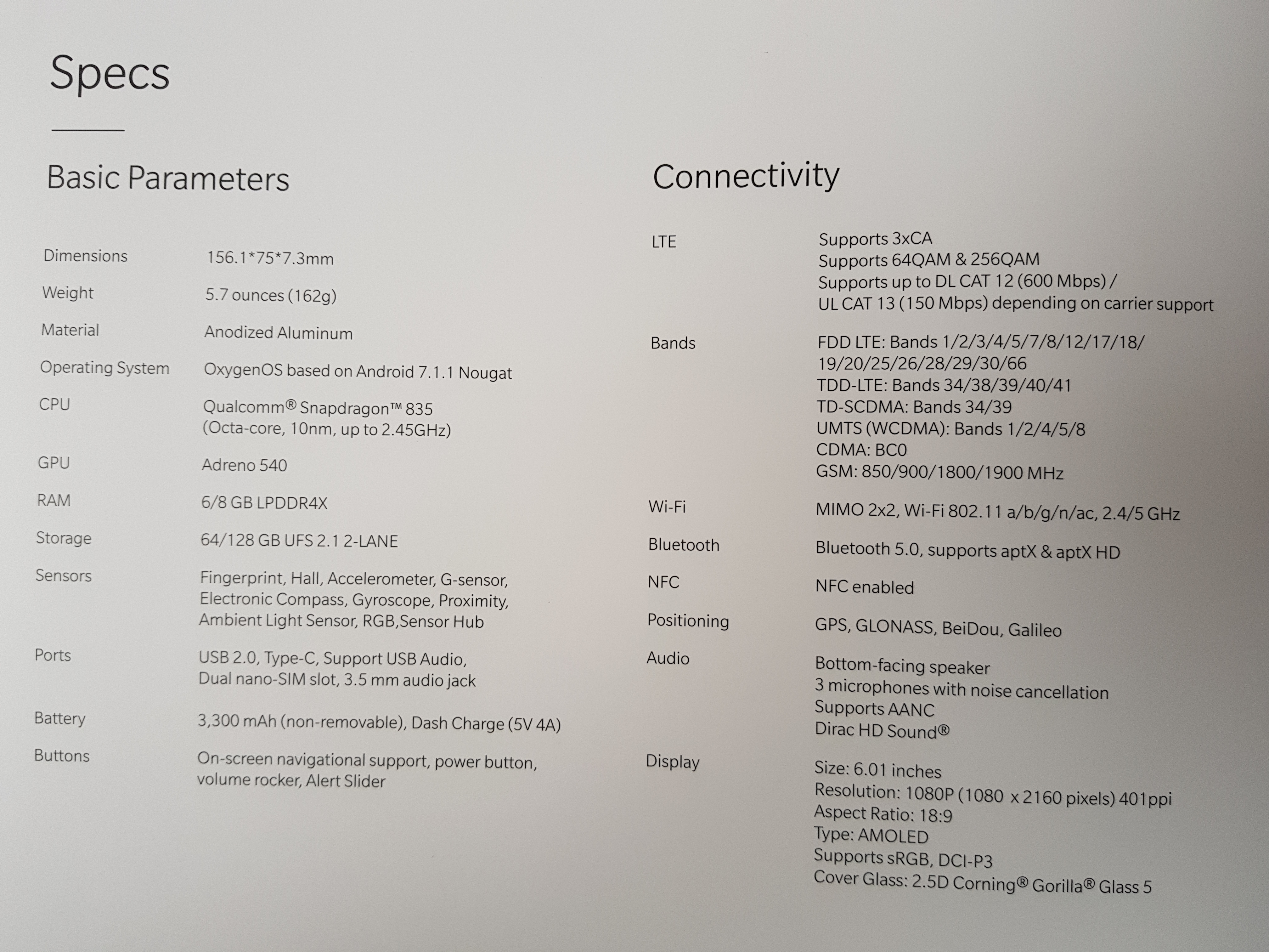 OnePlus 5T обзаведется 6-дюймовым optic-AMOLED дисплеем с разрешением 2160 х 1080 и соотношением сторон 18:9. Экран покрывает защитное стекло Gorilla Glass 5.