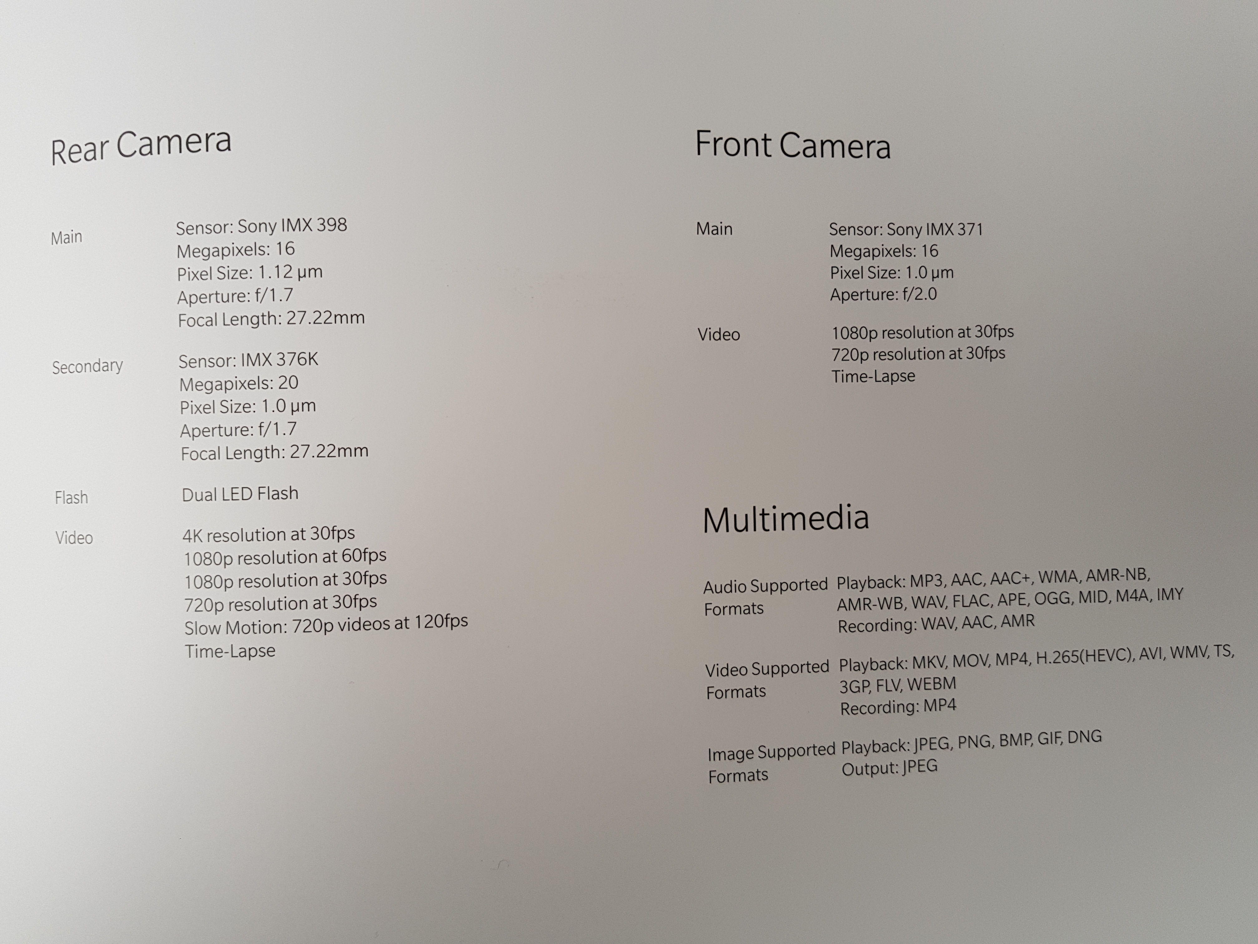 OnePlus 5T управляется процессором Snapdragon 835, имеет 6 ГБ/8 ГБ ОЗУ, 128 ГБ флэш-памяти UFS 2.1, двойную основную камеру с сенсорами Sony IMX398 на 16-Мп и Sony IMX376K на 20-Мп, диафрагмой F/1.7, поддержкой записи 4K-видео и электронной оптической стабилизацией изображения.