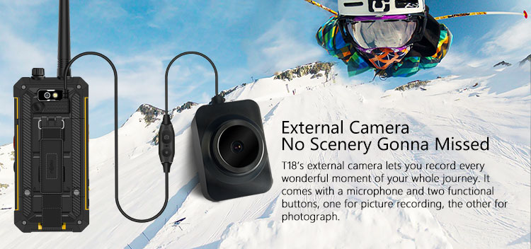 Предусмотрено также подключение внешней камеры. Она снимает фото и видео в HD-разрешении, оснащается микрофоном и двумя кнопками (для фото и видео). На тыльной панели, ниже основной камеры, есть специальный разъем для присоединения внешней камеры.