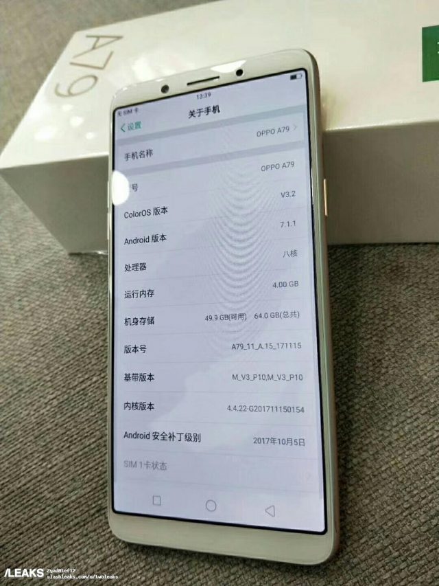 Oppo A79 оснастится 6.01-дюймовым экраном с разрешением 2160 х 1080 пикселей и соотношением сторон 18:9, процессором MediaTek Helio P23, 4 ГБ оперативной и 64 ГБ постоянной памяти, 16-Мп одинарной основной камерой и аккумулятором емкостью 2900 мАч.
