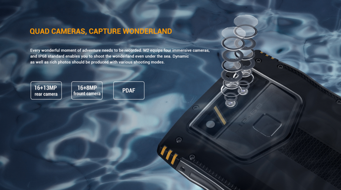 Основной особенностью новинки являются не ее защитные свойства, а наличие двойной основной камеры (16 Мп + 13 Мп) и двойной фронтальной камеры (16 Мп + 8 Мп). В обоих случаях производитель употребляет название PureView Carl Zeiss.