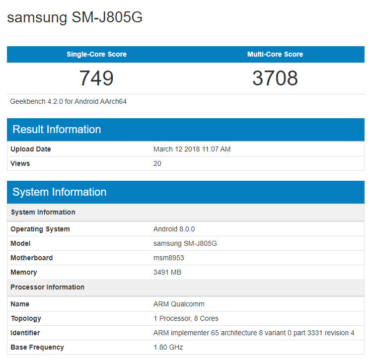 Пару недель назад мы видели данный телефон с чипсетом Exynos 7870 (это была версия SM-J800FN), на этот раз в базу данных теста попал вариант с процессором Snapdragon 625 (это версия SM-J805G).