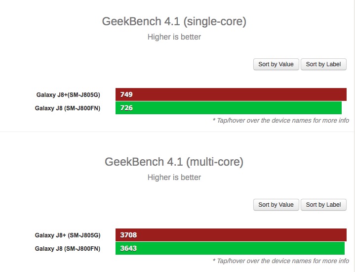 Модель J805G имеет 4 ГБ оперативной памяти, в то время как предыдущая модель, которую мы видели, имела 3 ГБ. Оба чипсета имеют процессор с восьмью ядрами Cortex-A53, но синхронизированы по-разному — 1,8 ГГц против 1,6 ГГц в пользу Galaxy J8+.
