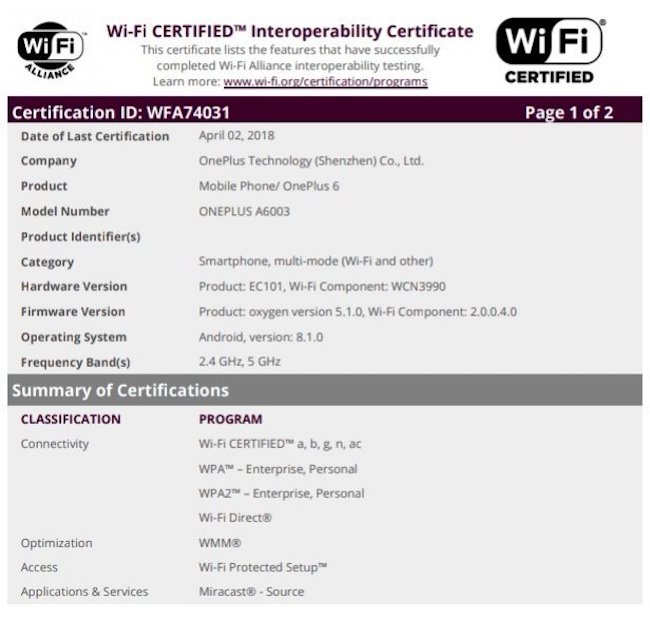 Свидетельство о WiFi сертификации показало, что телефон будет иметь название OnePlus 6 и номер модели A6003. Дата сертификации — 2 апреля 2018 года. В дополнение к названию сертификация подтверждает, что устройство будет работать под управлением Android 8.1 (Oreo) с Oxygen OS 5.1.0 поверх и поддерживать двухдиапазонный Wi-Fi 802.11ac, что подтверждает использование процессора Snapdragon 845.