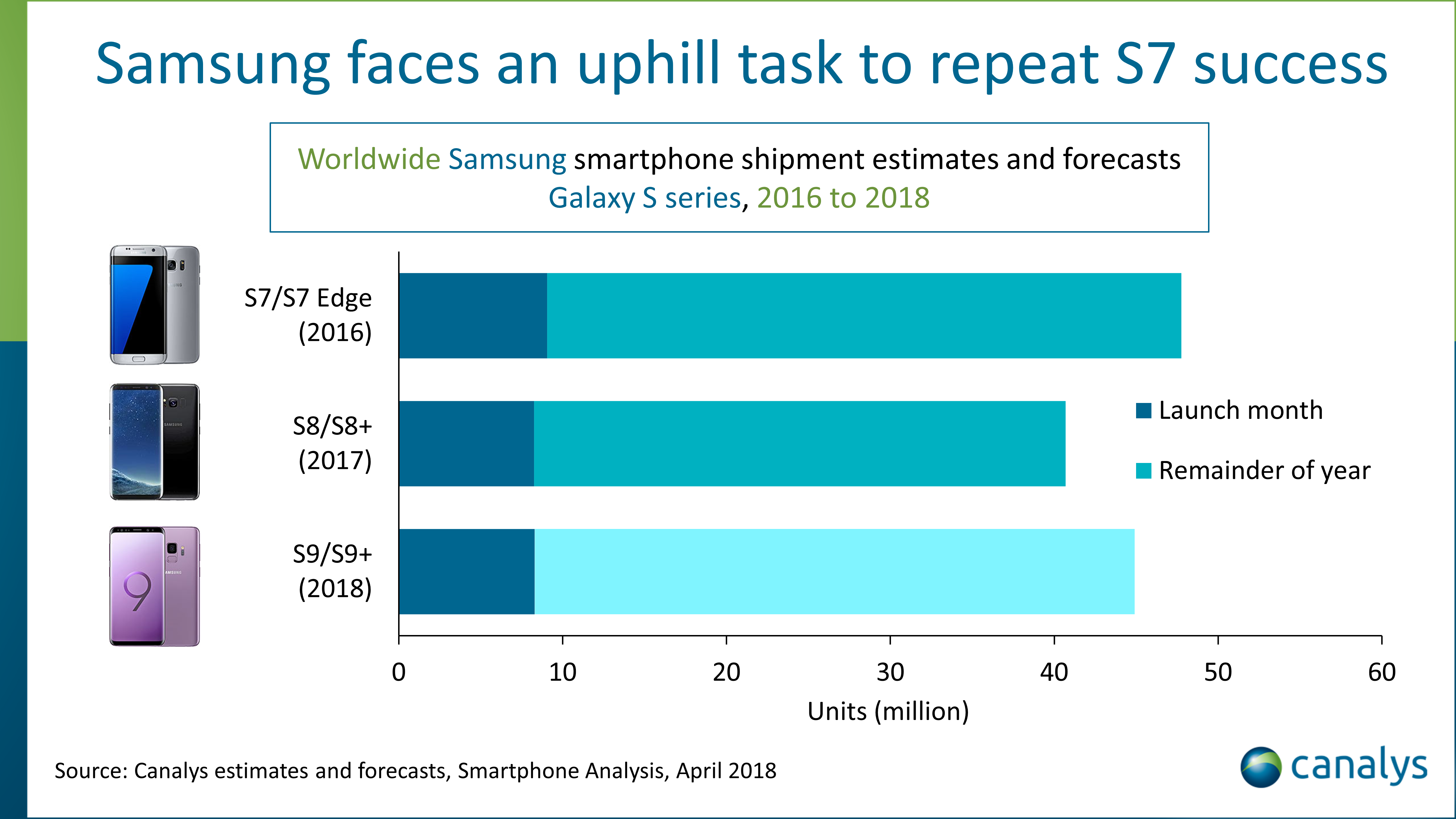 Аналитическая компания Canalys провела исследования, в рамках которых выяснила, сколько смартфонов Samsung Galaxy S9 и S9+ было продано к этому времени.