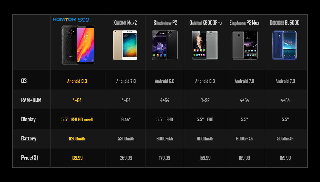 Homtom S99 оборудован 5.5-дюймовым дисплеем с соотношением сторон 18:9, 4 ГБ оперативной памяти, 64 ГБ флэш-памяти, управляется операционной системой Android 8.0 Oreo.