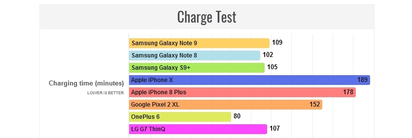 Полностью разряженный Note9 заряжается до 100% за 1 час и 49 минут. В указанном тесте дольше всех заряжаются iPhone 8 Plus и iPhone X (178 и 189 минут соответственно). Самым быстрым в плане зарядки стал OnePlus 6, у которого на указанный процесс уходит всего 90 минут.