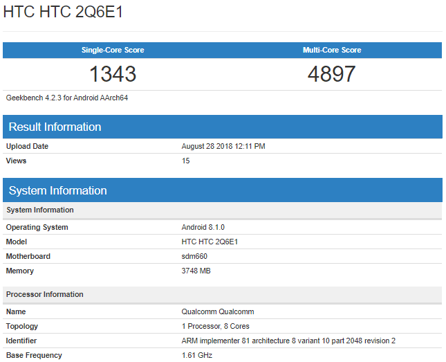 HTC U12 Life станет первым телефоном компании с набором микросхем Snapdragon 660. Это то, что показывает нам бенчмаркинг Geekbench.