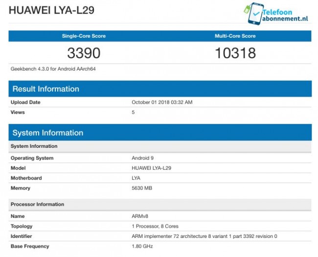 Телефон компании Huawei с кодовым именем LYA-L29 был обнаружен в базе данных Geekbench.