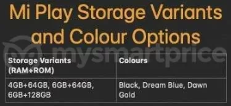 Согласно последним слухам, Xiaomi Mi Play будет продаваться в трех вариантах: 4 ГБ ОЗУ и 64 ГБ встроенной памяти, 6 ГБ ОЗУ и 64 ГБ встроенной памяти, 6 ГБ ОЗУ и 128 ГБ встроенной памяти. В наличии будет слот для карт microSD. Покупатели смогут выбрать между цветовыми вариантами Black, Dream Blue и Dawn Gold.