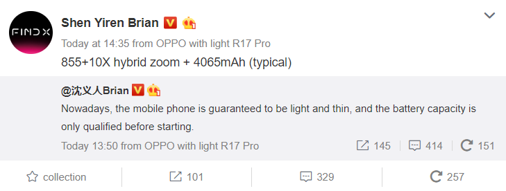 На днях вице-президент Oppo Брайан Шен разместил в Weibo некоторые характеристики грядущего устройства. В своем посте он сообщил, что телефон будет работать на процессоре Snapdragon 855 и оснащен 10-кратным гибридным зумом. Речь идет о новой технологии 10-кратного зума, которую компания продемонстрировала на выставке MWC 2019.
